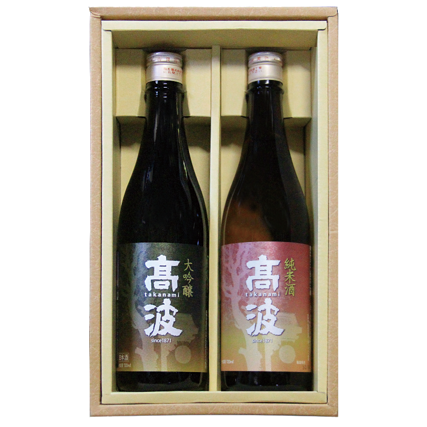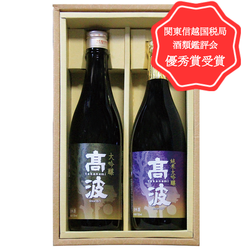 吟醸の部で入賞した自慢の「大吟醸」原酒と、純米吟醸の部で入賞した華やかな「純米大吟醸」。高波極めの逸品酒セットです。