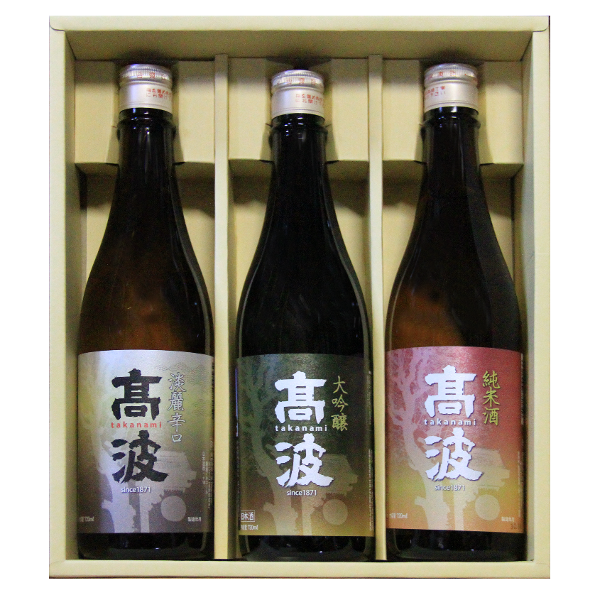 キレの良い「大吟醸」と、味わい深い「純米吟醸」に飲み口が軽やかな「純米酒」をセットにした高波推奨の3酒ギフト。